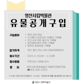 유물 매도신청을 원하는 시민은 영천시 홈페이지 고시/공고란에서 ‘2023년 3차 유물 구입 공고’ 서식을 작성해 제출하면 된다.