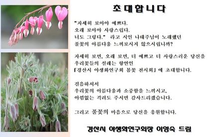 이번 행사를 주관하는 경산시 야생화연구회 이영숙 회장은 "야생화의 봄꽃이 가장 아름다운 5월을 맞아, 많은 도시민에게 우리 꽃 야생화의 아름다움과 소중함을 알리고, 함께하고자 전시회를 개최하게 됐다. 야생화에 관심 있는 분은 누구든지 ‘경산시 야생화연구회 봄꽃 전시회’에 오시길 바란다”며 초대의 말을 했다. 아울러, 행사 준비를 위해 아낌없는 지원을 해준 경산시와 농업기술센터에 고마운 마음을 표했다.