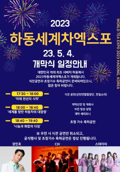 한편, 2023하동세계차엑스포는 경남도와 하동군이 공동 주최하고 (재)하동세계차엑스포조직위원회가 주관하는 차 분야에서 최초로 정부 승인을 받은 국제행사다.
