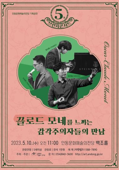 [제주교통복지신문 김강석 기자] 안동문화예술의전당는 5월 브런치 콘서트를 맞아 10일 오전 11시 백조홀에서 미술 작품과 음악을 함께 느낄 수 있는 오감 만족 콘서트 ‘끌로드 모네를 느끼는 감각주의자들의 만남’을 진행한다.