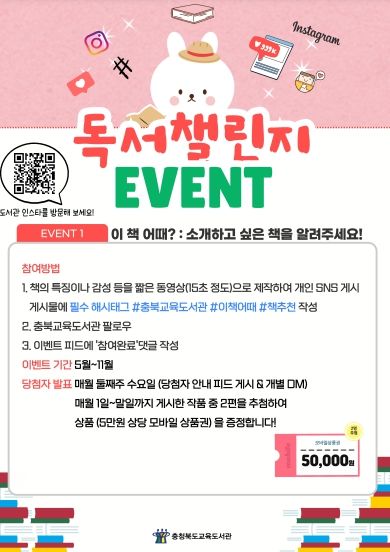 5월부터 충청북도교육도서관 SNS 이벤트에 참여할 수 있으며 참여자를 대상으로 추첨하여 소정의 상품을 지급할 예정이다.