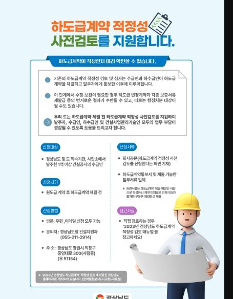 이와 더불어 경남도는 자체적으로 하도급계약 적정성 검토가 어려운 영세 건설업체를 위해 ‘하도급계약 적정성 사전검토’도 지원한다고 밝혔다.
