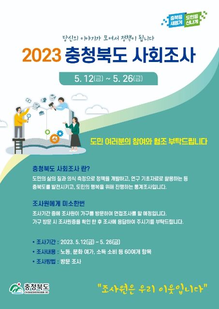 [제주교통복지신문 김강석 기자] 음성군은 오는 12일부터 26일까지 15일간 음성군 지역 내에서 표본으로 선정된 960가구의 만 13세 이상 가구주 및 가구원을 대상으로 ‘2023년 충청북도 사회조사’를 실시한다.