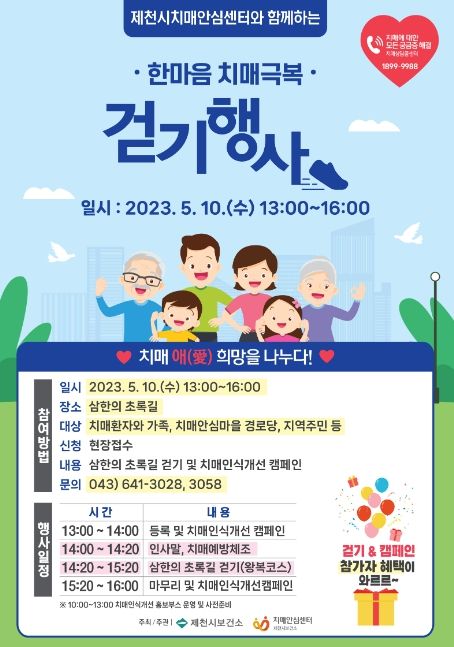 [제주교통복지신문 김강석 기자] 제천시는 오는 10일 오후 1시부터 4시까지 삼한의 초록길 일원에서 ‘한마음 치매극복 걷기행사’를 개최한다.