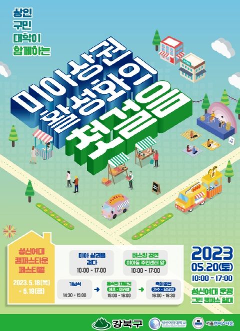 [제주교통복지신문 김강석 기자] 서울 강북구는 지역상권 활성화를 위해 상인·구민·성신여대와 함께하는 ‘미아상권활성화의 첫걸음’을 오는 20일(토) 성신여대 운정그린 캠퍼스 일대에서 개최한다고 밝혔다.