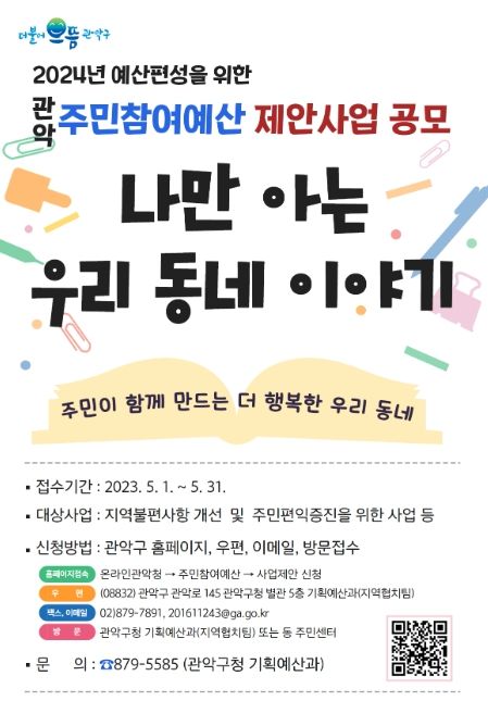 [제주교통복지신문 김강석 기자] 관악구가 2024년도 주민참여예산 규모를 18억 원으로 정하고 주민들의 다양한 의견을 반영하기 위한 ′주민참여예산 제안사업‘ 공모를 오는 31일까지 실시한다.