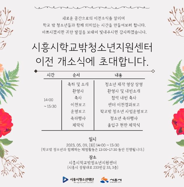 [제주교통복지신문 김강석 기자] 시흥시청소년재단 산하기관인 시흥시학교밖청소년지원센터가 새로운 공간으로 이전하면서 오는 9일 14시, 정왕어울림국민체육센터 3층에서 ‘이전 개소식’을 진행한다.