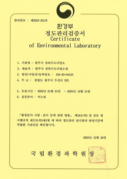 [제주교통복지신문 김강석 기자] 원주시 상하수도사업소는 환경부 국립환경과학원이 주관한 먹는 물 검사기관 정도관리 평가에서 ‘적합’판정을 받았다.