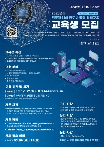 [제주교통복지신문 김강석 기자] 경기도와 한국나노기술원이 도내 전문대졸업(예정)자 대상 2023년도 반도체 공정·장비 교육생을 8일부터 21일까지 모집한다.