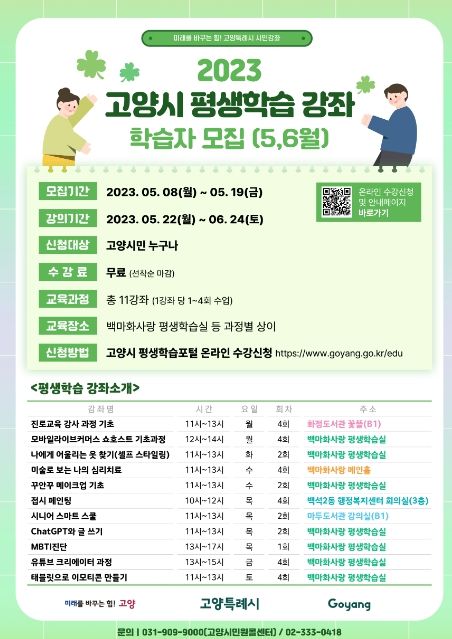 수강신청은 고양시 평생학습포털에서 5월 8일(월) 09:00부터 19일(금) 18:00까지 온라인으로 진행된다. 문의는 고양시민원콜센터나 평생교육과로 하면 된다.