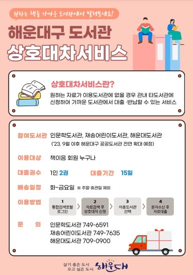 노장석 해운대도서관장은 “상호대차서비스는 도서 대출 편의성을 높여 지역 주민의 도서관 이용과 독서 만족도를 높일 것”이라며, “참여 도서관 간 긴밀한 협력으로 이 서비스가 원활히 정착되도록 하겠다”고 말했다.