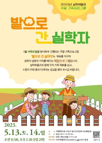 '밭으로 간 실학자'는 2023년 5월 13일과 14일 이틀간 총 4회, 회당 가족 10팀을 선착순으로 모집하여 무료로 진행된다. 신청은 지지씨멤버스에서 이루어지며, 자세한 사항은 실학박물관 누리집과 인스타그램을 통해 확인할 수 있다.