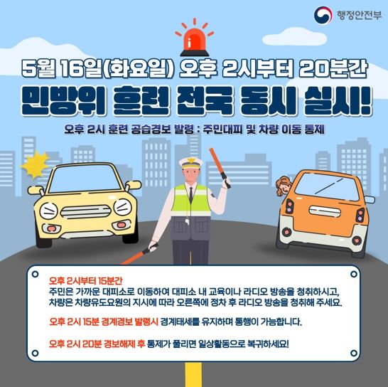 이번 훈련은 공습상황에 대비해 주변 민방위 대피소 또는 안전한 장소를 찾아 대피하고, 비상시의 국민 행동 요령 숙달 및 지자체·군·경찰·소방 등의 유기적인 상호 협력체계를 강화하고자 마련됐다.