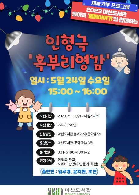 이번 재능기부 인형극 ‘혹부리 영감’은 공연 당일 3층 문화교실에서 진행된다. 관람 가능 연령은 7-9세, 참여 인원은 20명이다.