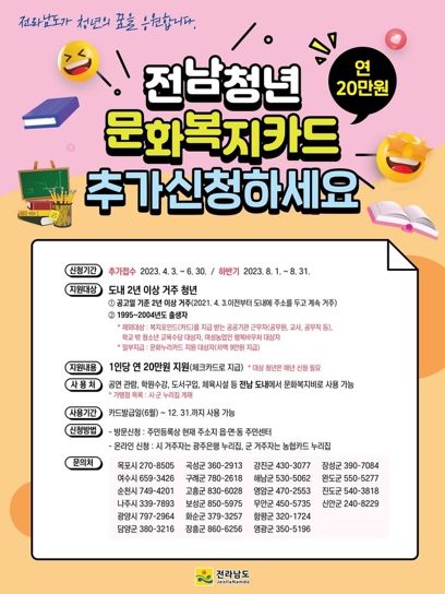 [제주교통복지신문 김강석 기자] 전남 강진군이 관내 청년들을 대상으로 ‘전남청년 문화복지카드’ 지원사업 대상자를 추가 모집한다고 8일 밝혔다.