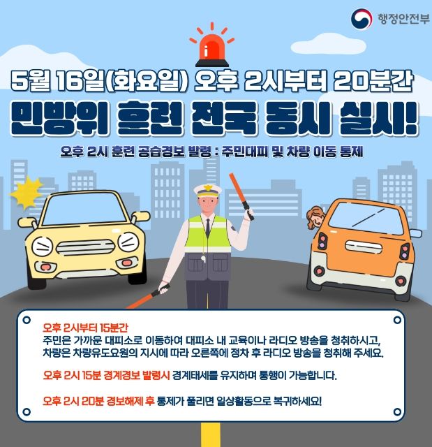 이후 오후 2시 15분 훈련 경계경보가 발령되면 국민들은 지하대피소에서 나와 경계 태세를 유지하면서 통행이 가능해지며, 오후 2시 20분 경보 해제 후 일상으로 복귀하면 된다.
