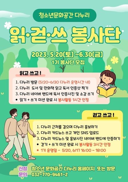 봉사단 모집인원은 회차별 15명이며, 참가를 희망하는 청소년은 8일부터 마감 시까지 청소년문화공간 다누리 홈페이지 또는 방문해 신청할 수 있다.