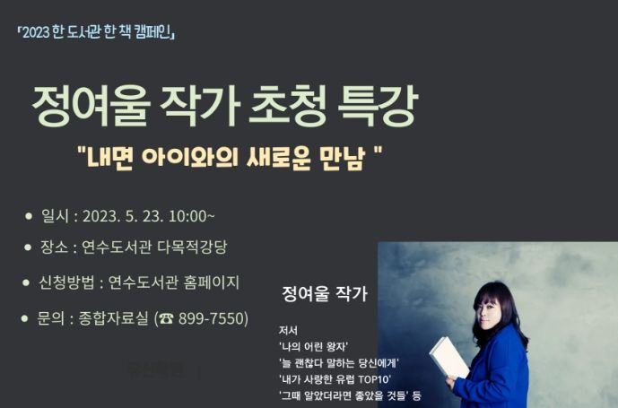 특강은 ‘내면 아이와의 새로운 만남’을 주제로 23일 오전 10시 연수도서관 다목적강당에서 지역주민 50여 명을 대상으로 진행한다.