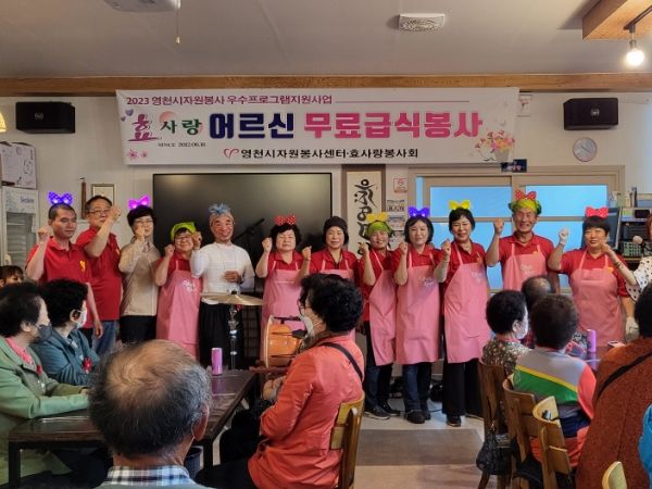 12년째 이어지고 있는 효사랑봉사회의 급식 봉사는 매달 첫째, 셋째 토요일이면 어르신들께 점심을 드리며 난타, 색소폰, 타령 등 각종 소공연까지 선보이며 즐거움을 선사하고 있다. 2023년에는 (사)영천시자원봉사센터의 자원봉사 우수프로그램으로도 선정됐다.