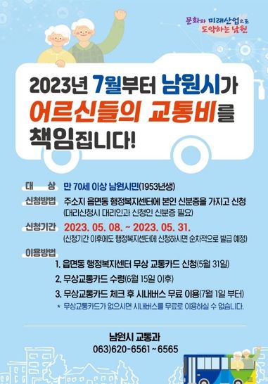 [제주교통복지신문 김강석 기자] 남원시는 어르신들의 교통비 절감과 외부활동 증가로 행복한 노후생활을 통한 삶의 질 향상을 위해 7월 1일부터 시행하는 만 70세 이상 어르신 무상교통카드를 8일부터 주소지 읍면동 행정복지센터에서 신청받는다고 밝혔다.