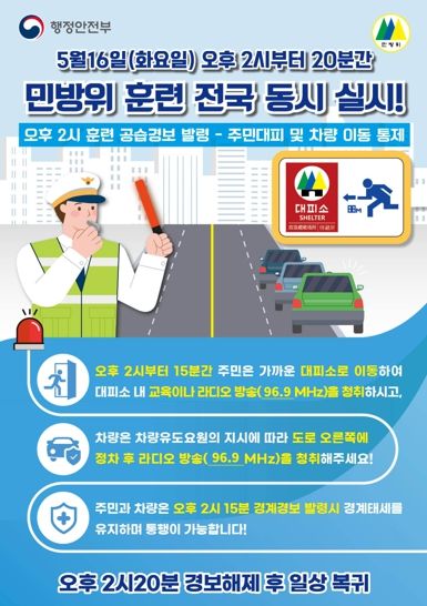 시는 16일 오후 2시부터 20분간 공무원과 민방위 대원을 주축으로 적 항공기 출현이나 미사일 발사 등 공습상황에 대비한 실제 비상 대피 훈련을 추진한다.