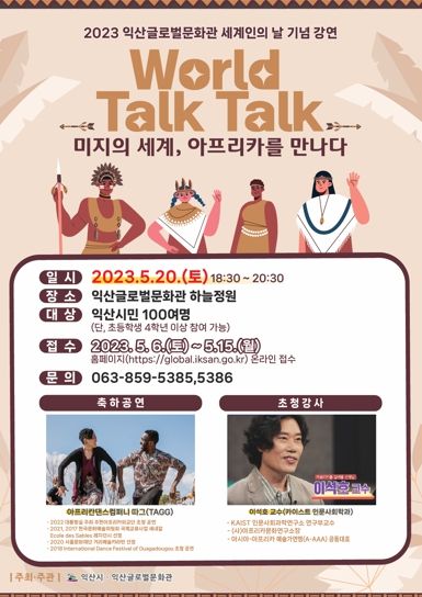 [제주교통복지신문 김강석 기자] 익산글로벌문화관은‘2023 세계인의 날’을 맞이해 세계시민 강연‘World Talk Talk’을 20일 개최한다.