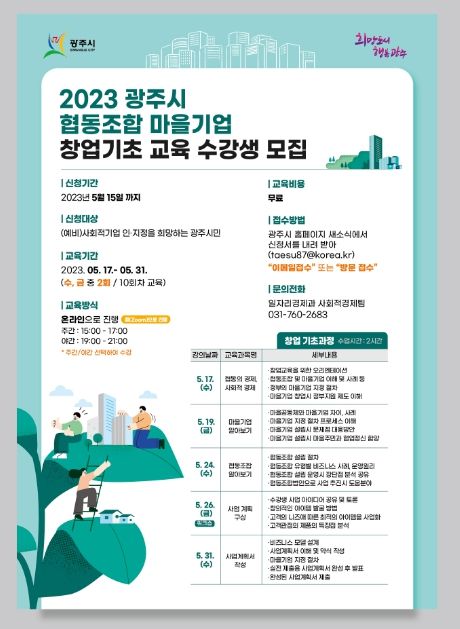 [제주교통복지신문 김강석 기자] 광주시가 사회적경제 활성화를 위해 ‘광주시 사회적경제 창업 기초과정(협동조합, 마을기업)을 개설하고 15일까지 수강생을 모집한다.
