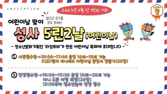 [제주교통복지신문 김강석 기자] 고양시청소년재단 성사청소년문화의집은 오는 6일 어린이날 맞이 ‘성사 5린2날(어린이날) 축제’를 운영한다고 밝혔다.