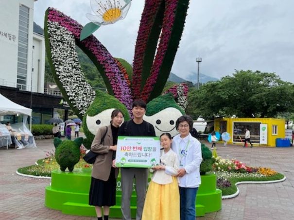 조직위는 이날 5월 7일 엑스포 10만 번째 입장객과 기념 촬영을 하고 기념품으로 차다기세트를 전달했다.