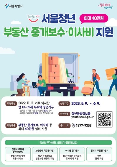 [제주교통복지신문 김강석 기자] 서울시가 5월 9일부터 일자리, 학업 등으로 이사가 잦은 청년들의 주거비 부담을 덜어주기 위해 ‘청년 부동산 중개보수 및 이사비 지원사업’ 참여자를 모집한다.