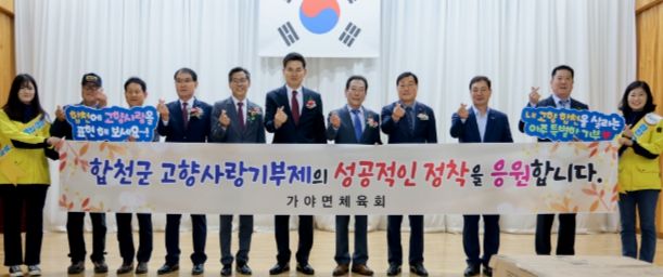 또한 이날 김태호 국회의원이 가야면민체육대회에 참석해 가야면체육회와 함께 ‘합천군 고향사랑기부제의 성공적인 정착을 응원합니다’라는 메시지로 합천 고향사랑기부제의 제도 활성화를 기원하고 힘을 보태는 응원의 시간을 가졌다.