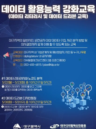 [제주교통복지신문 김강석 기자] 대구광역시와 대구디지털혁신진흥원이 운영하고 있는 ‘대구 빅데이터 활용센터’에서는 데이터 활용 능력을 높이기 위한 교육 프로그램으로 ‘데이터 문해력’과 ‘데이터 기반 문제해결’ 교육을 실시한다.