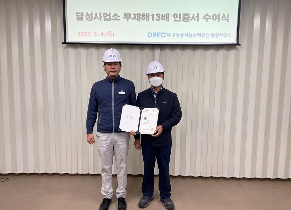 [제주교통복지신문 김강석 기자] 대구공공시설관리공단 달성사업소는 기본 원칙을 준수하며 적극적인 사고 예방 활동을 실천한 결과 지난 3월 28일 무재해 사업장 13배수(2,519일+319,220시간)를 달성했다.