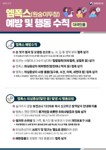 엠폭스는 원숭이두창 바이러스 감염에 의한 급성 발열, 발진성 질환으로 국내 확진환자의 주요 증상은 항문‧생식기에 통증을 동반한 국소 피부병변(궤양, 종창, 발진)이며 초기에는 감기와 유사하게 발열, 두통, 림프절 비대 등이 나타났다.