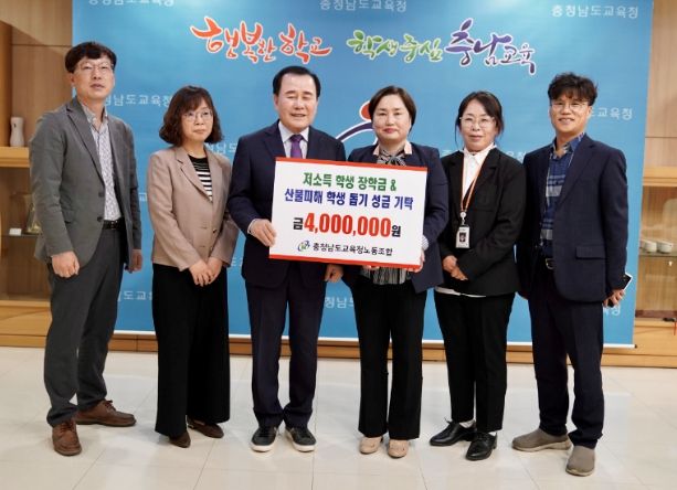 [제주교통복지신문 김강석 기자] 충남교육청은 8일 충청남도교육청공무원노동조합(위원장 이관우)으로부터 저소득가정 장학금 및 4월 초 산불 피해 학생들을 돕기 위한 성금 400만 원을 전달받았다.