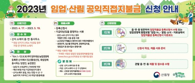 올해 임업직불금 신청 기간은 4.17∼5.19까지이며, 산림청은 지방자치단체, 소속기관과 협력해 방송, 신문, 인터넷, 문자 등 다양한 매체와 방법으로 직불금 신청을 독려해 왔다.