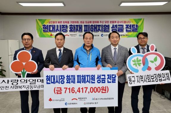 김찬진 동구청장은 “피해 상인들의 어려움에 공감하고 관심을 가져 주신 많은 기업과 단체, 개인 기탁자들과 모금 활동에 전념해주신 인천사회복지공동모금회, 재해구호협회에 감사드린다”며 “하루빨리 현대시장이 활력을 되찾을 수 있도록 모든 행정력을 집중해 최선을 다하겠다”고 말했다.