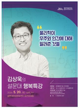 [제주교통복지신문 김현석 기자] 제주특별자치도 설문대여성문화센터는 20일 오후 2시 ‘물리학이 우주와 인간에 대해 알려준 것들’이라는 주제로 김상욱 교수를 초청해 설문대 행복특강을 실시한다.