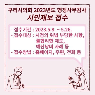 [제주교통복지신문 김강석 기자] 구리시의회는 2023년도 행정사무감사에 앞서 5월 8일부터 5월 26일까지 19일간 시민 제보를 받는다.