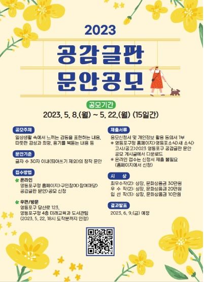올해 3회를 맞은 이번 공모의 접수기간은 5월 8일부터 5월 22일 까지이다. 주제는 일상에서 느끼는 감동을 표현하는 내용 또는 따뜻한 감성과 희망, 용기를 북돋는 내용이면 된다. 문안은 띄어쓰기를 제외하고 30자 내외의 순수 창작 글귀여야 한다. 거주 지역과 나이에 상관없이 누구나 참여할 수 있다. 접수방법은 영등포구청 홈페이지에 게시된 링크에 접속하거나 홈페이지 신청서를 다운로드해 우편 또는 방문으로 접수하면 된다.