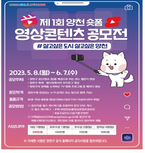 이기재 양천구청장은 “모바일로 언제, 어디서나 짧은 영상을 즐기는 요즘 트렌드에 발맞춰 ‘제1회 양천 숏폼 영상콘텐츠 공모전‘을 준비했다”면서 “이번 공모전을 통해 양천의 천만가지 매력이 가득 담긴 영상들이 발굴되길 기대하며, 관심 있는 분들의 많은 참여 바란다”고 말했다.