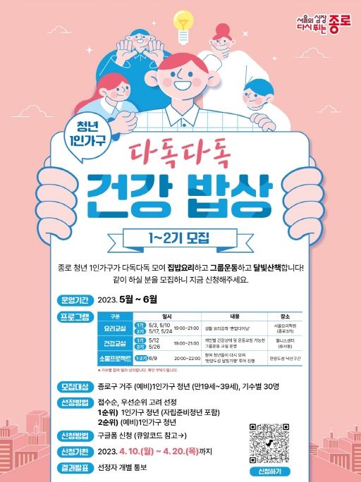 [제주교통복지신문 김강석 기자] 종로구가 5~6월 1인가구 청년의 식습관 및 건강 관리를 위해 '다독다독 건강 밥상' 프로그램을 운영한다.