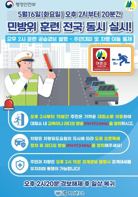이번 훈련은 2017년 이후 약 6년 만에 재개됐다. 훈련은 공습경보 발령, 경계경보 발령, 경보해제 순으로 진행된다. 5월 16일 오후 2시 정각에 공습경보가 발령되면 공공기관, 기업체, 다중이용시설, 학교, 아파트 등 각 기관에서는 시설 내 자체 방송망을 통해 훈련 상황을 시민들에게 전파해야 한다.
