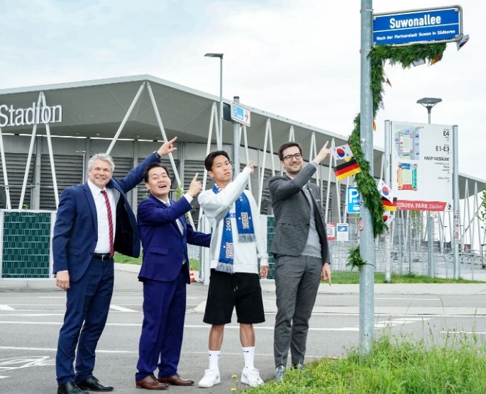 마르틴 호른 시장은 “유로파파크 슈타디온과 수원가로수길이 있는 이곳은 프라이부르크의 심장과 같은 곳”이라며 “유로파파크 슈타디온을 새로 지으면서 두 개의 길이 생겼는데, 수원시와 자매도시결연을 기념하기 위해 그중 하나를 수원가로수길이라고 이름을 붙였다”고 설명했다.