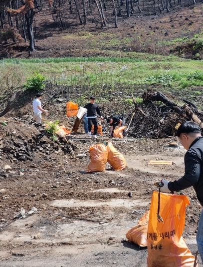 이날 농촌 일손돕기에 참여한 직원은 15명으로 당면한 업무를 잠시 미루고 산불 피해로 전소된 주택 철거로 인해 발생한 잔해 및 주변 쓰레기 수거 등 환경정비 작업에 힘을 보탰다.