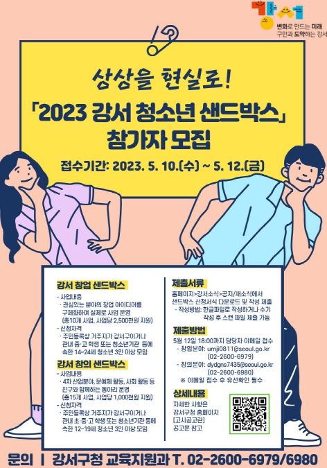 [제주교통복지신문 김강석 기자] 서울 강서구는 청소년이 기획하고 운영하는 창업·창의 동아리 지원 사업인 ‘강서 청소년 샌드박스’ 참가자를 모집한다.