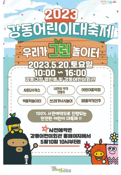 가정의 달을 맞아 강동구청과 강동어린이회관에서 열리는 2023 강동 어린이 대축제 ‘우리가 그린 놀이터’에서는 현재의 기후위기 시대 속 영유아들이 쉽고 재미있게 환경에 관심을 가질 수 있도록 환경과 관련된 다양한 놀이를 체험해 볼 수 있다.