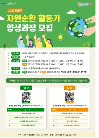 접수 대상은 자원순환에 관심이 많고 적극적으로 참여 가능한 강동구민이며, ‘자원순환 활동가’는 입문 과정은 5월 30일까지 30명, 심화 과정은 6월 16일까지 30명, ‘업사이클 교육프로그램’은 교육 마감일인 6월 15일까지 프로그램당 15명을 모집한다. 접수 방법은 온라인 또는 유선으로 접수 가능하며 자세한 사항은 강동구청 청소행정과 또는 에코플레이로 문의하면 된다.