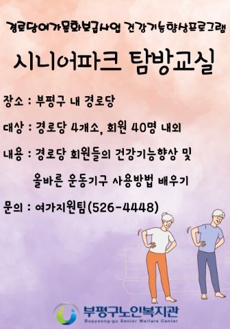 [제주교통복지신문 김강석 기자] 부평구노인복지관는 경로당 건강기능 향상 프로그램에 참여하는 경로당 4개소 이용 어르신 40명을 대상으로 신체활동을 위한 ‘시니어 파크 탐방교실’ 프로그램을 운영한다고 밝혔다.