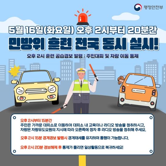 응급구조 차량 등의 비상차로로 활용하기 위해 15분간 차량 이동도 통제된다. 이때 운행 중인 차량은 도로 오른쪽에 정차한 후 차내에서 훈련 상황을 라디오 등을 통해 청취해야 한다.
